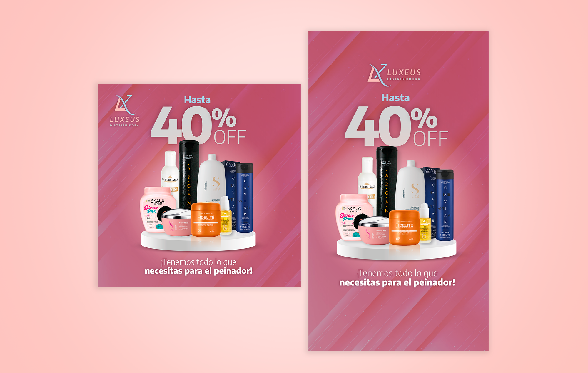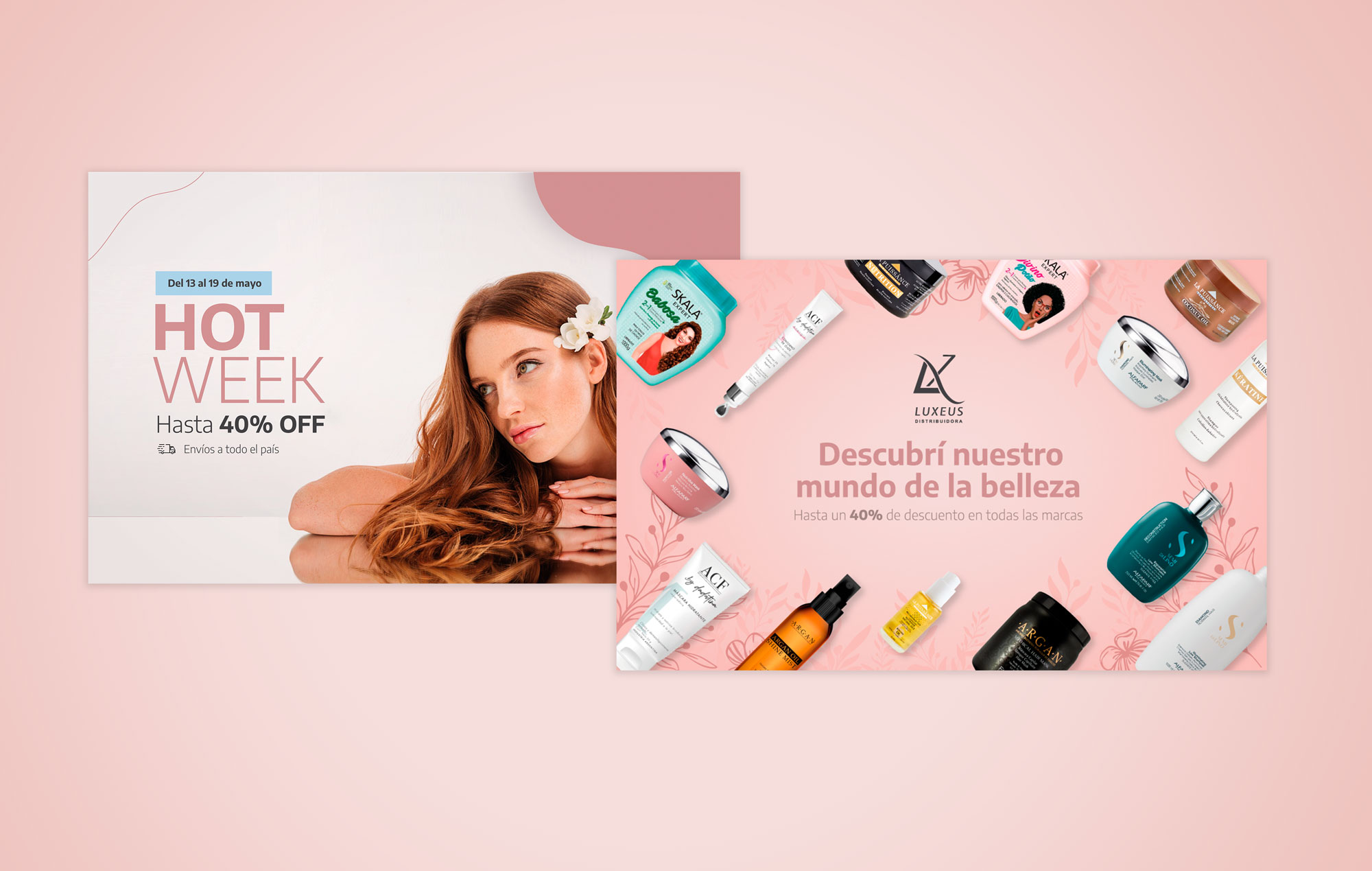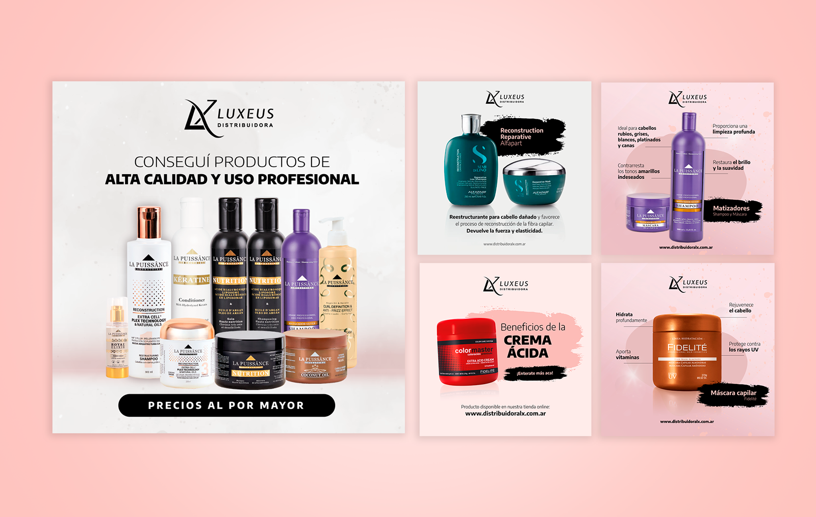 Para Luxeus desarrollo banners para su pagina web y placas para redes sociales, planificación de contenido de posteos, copys y diseños de pautas publicitarias.